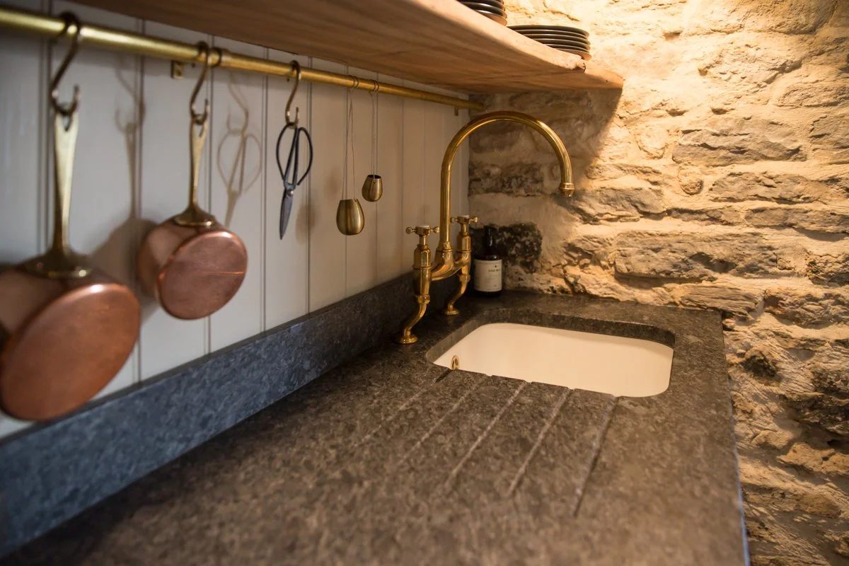 This is one of the quaintest Grade II listed properties with a classic layout of one up one down. The brief for this cottage was to create a luxury holiday bolt hole, taking on the feeling of a cosy log cabin while maintaining a sense of pampered elegance. Transforming this space was no small task, but it is amazing what you can do when walls are knocked down, electrics and gas mains are moved and new cabinetry built throughout. By moving the mains for the electrics and gas I was able to create a cosy window seat in the living area which couples up nicely for dining. Under the stairs is always a great place to make use of storage solutions, so this was the perfect spot to keep the washing machine and tumble dryer, not to mention a great place to store the logs. To enhance the feeling of space in this tiny cottage, with an emphasis on clean crisp lines, beautiful solid hand made shutters were fitted in the bedroom windows, creating a sense of chic style while brilliantly blocking out the light, perfect for a holiday cottage and those lazy morning lie-ins.